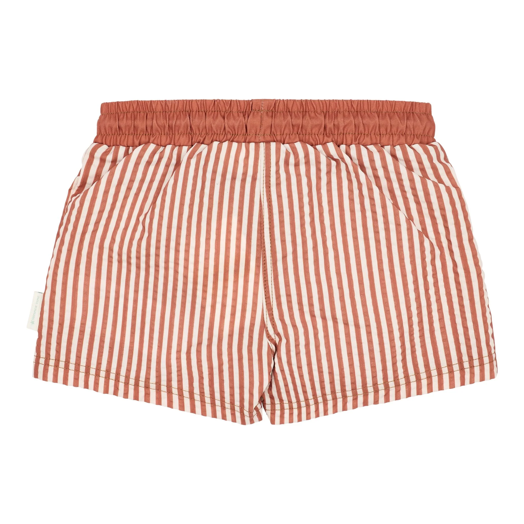 Estos bañadores cortos marrones con rayas marrones están diseñados para pequeños aventureros que disfrutan moviéndose con libertad. Confeccionados en un tejido seersucker ligero y transpirable, ofrecen un ajuste cómodo y amplio, perfecto para los días cálidos llenos de juegos junto al agua. La cintura elástica con cordón ajustable garantiza un ajuste perfecto, para que los bañadores se mantengan en su sitio incluso al correr, saltar y chapotear. Las clásicas rayas en tonos marrones cálidos les dan un toque fresco y atemporal. No olvides la crema solar para proteger a tu pequeño.