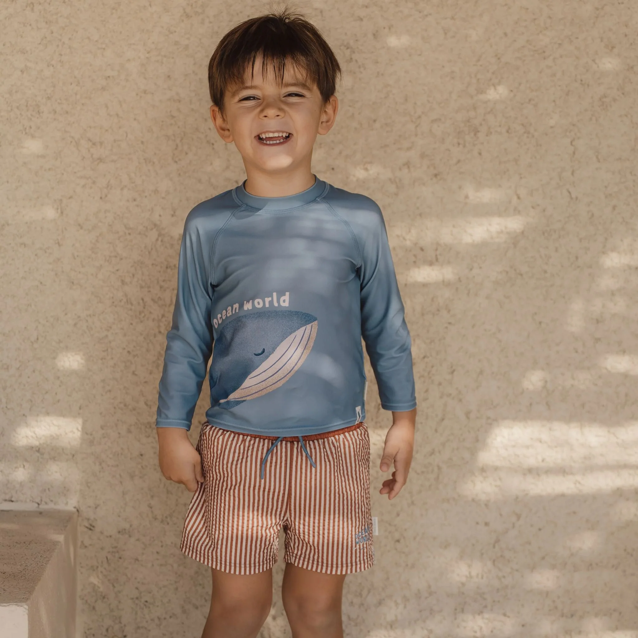 Sol en la cara, pies en la arena y listos para explorar. La camiseta de baño de manga larga Ocean Blue es para los pequeños aventureros que se lanzan al verano con los brazos abiertos. El azul intenso y la simpática ballena le dan a la camiseta un aspecto resistente y a la vez suave. Está confeccionada con un tejido suave y cómodo que resulta agradable al tacto y proporciona una libertad de movimiento óptima. Gracias a las mangas largas y la protección UPF40+, tu hijo estará protegido del sol, incluso durante los días más largos de playa. No olvides la crema solar para proteger a tu pequeño. La ballena nada literalmente junto a la camiseta: un detalle alegre que hace que cada chapuzón sea aún más especial. Combínala con un bañador a juego para un look veraniego completo.