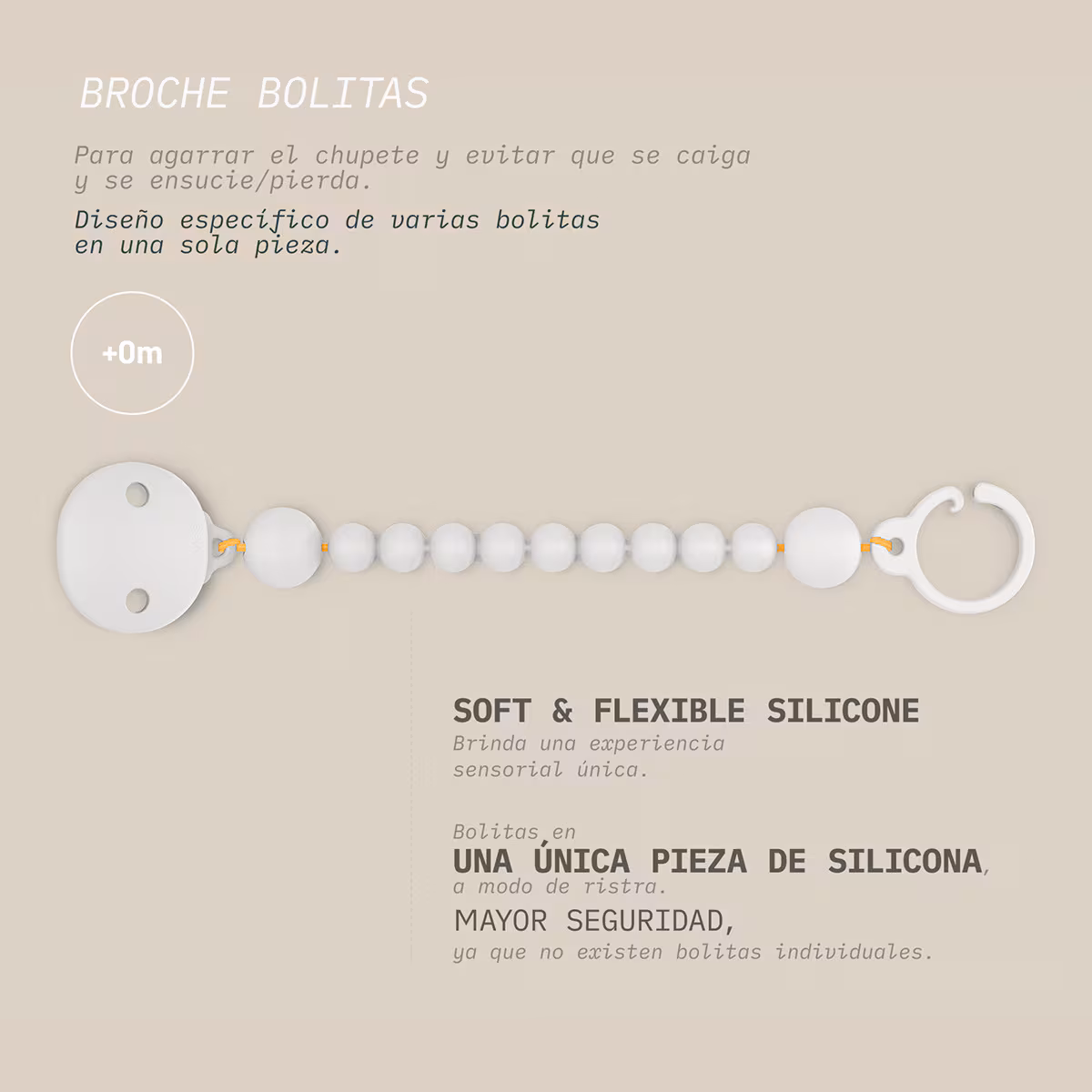 Broche pinza de bolitas silicona en una única pieza. Este broche permite sujetar los chupetes a la ropita del bebé, evitando así que caiga al suelo, se ensucie, o se pierda.