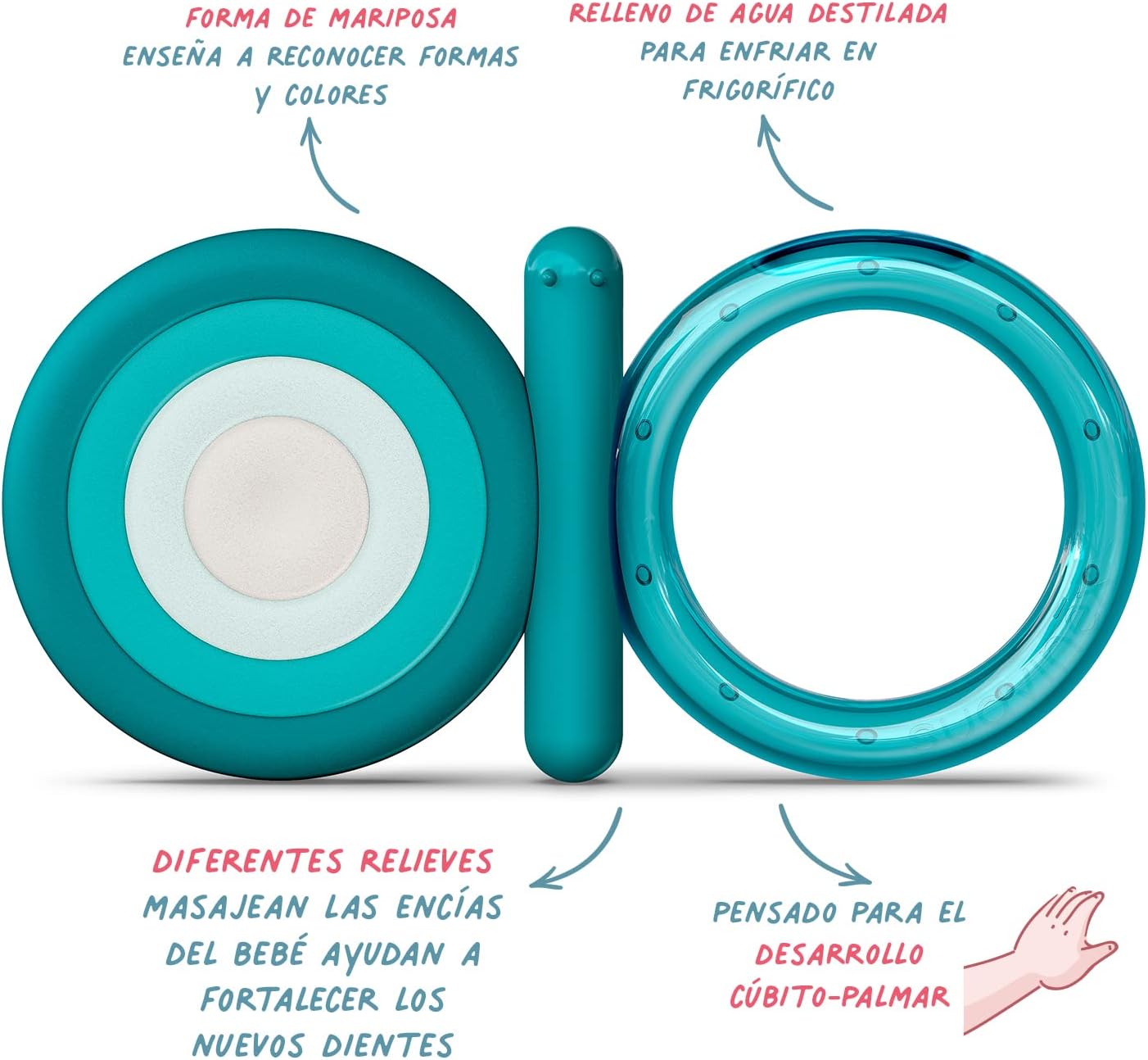 - Mordedor de Etapa 2. Diseñado para adaptarse a las manitas del bebé y pensado para el desarrollo cúbito – palmar. Con forma de mariposa, que ayuda al bebé a reconocer formas y colores