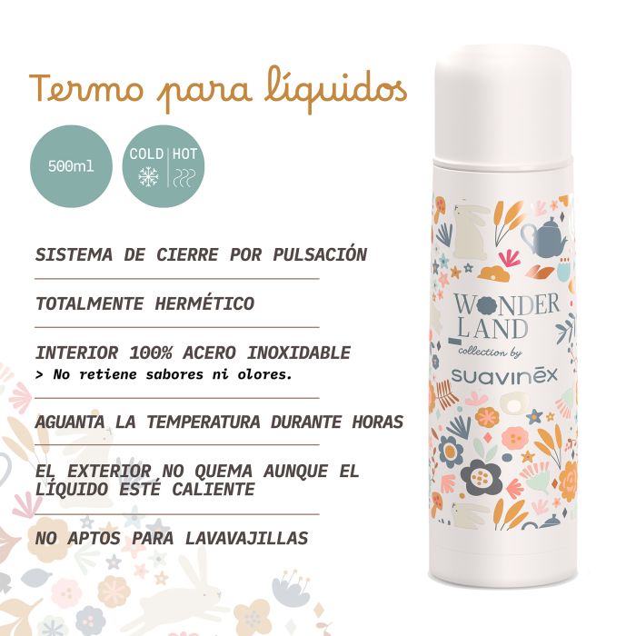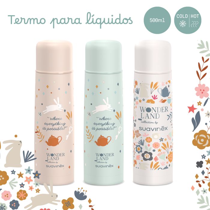 El termo Wonderland para líquidos 500ml Suavinex permite transportar bebidas calientes y frías, manteniendo su temperatura durante varias horas. Para bebés +0 meses. Termo de bebé muy útil para llevar las tomas del bebé cuando sales de paseo o para dejar preparadas las tomas nocturnas en casa. Capacidad 500ml. Perfecto para disfrutar dentro y fuera de casa. Ventajas: no mantiene olores, no retiene sabores, cierre hermético, cierre por pulsación, interior de acero inoxidable. Antes del primer uso y para la limpieza diaria, recomendamos lavar a mano con jabón diluido en agua templada, dejando escurrir con la boca hacia abajo para que el agua no quede dentro. No lavar en lavavajillas. No calentar en microondas. No congelar el termo. Para un mejor mantenimiento de la temperatura del alimento: calentar o enfriar previamente el recipiente antes de su uso (dependiendo de si el alimento a introducir es caliente o frío). Llenar con agua caliente/fría el recipiente, tapar y dejar reposar durante 5 minutos. Vaciar el agua y llenar con el alimento deseado. Este termo para líquidos es parte de la nueva colección Suavinex Wonderland.